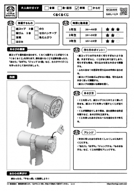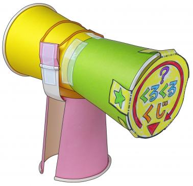 紙コップ3個を組み合わせて、くるくる回すとくじが出てくる「くるくるくじ」を作ります。数を書いたくじで点数を競ったり、「あたり」「はずれ」「ジャンプ10 回」など、カスタマイズくじを作ったりしてあそびましょう。
