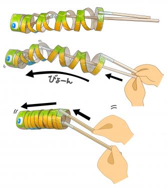 トイレットペーパーの芯をジグザグに切って、伸びたり縮んだりする「しゃくとりむし」を作ります。2本の割り箸を動かすと上下にも動き、「しゃくとりむし」のような動きをします。いきいきと本物そっくりに動かせるかな?