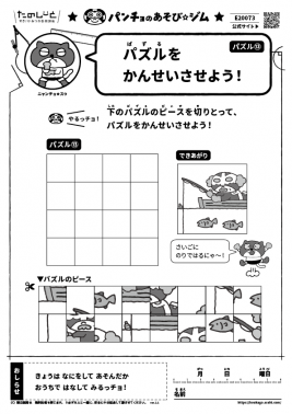 9分割、16分割、20分割のキャラクターのパズルを完成させる図形あそびです。どのピースがどのピースとつながるのか、模様をよく観察して組み合わせます。パズルのピースをはさみで切ったり、のりで貼ったりする作業も楽しめます。