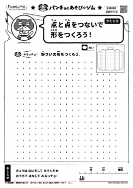 点と点を線でつないで、「やさい」の形を作る図形あそびです。どんな形でも自分で考えて、自由に形を作ることが大切です。点が細かくなるほど、複雑な形が表現できます。また、線をまっすぐ引く運筆の練習にもなります。