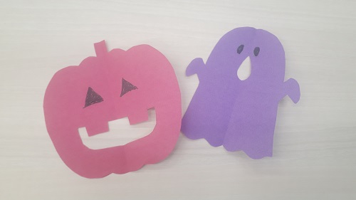 ハロウィーンの飾りつけにぴったりの切り絵です。好きな色のおりがみで、カラフルなかぼちゃやおばけを作りましょう。目や模様を描くことで、自分だけのオリジナルのハロウィーン飾りになります。