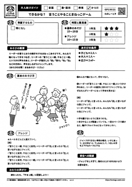 リーダーの言うとおりの動きをまねっこするあそびです。みんなで輪になって手をつなぎ、リーダーの「言うこと一緒、やること一緒」というかけ声のあと、リーダーが指示した「前」「後ろ」「右」「左」などの方向に、声をだしながらジャンプします。
