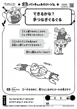 2人1組で頭と頭を合わせるように床に寝転がり、両手をつないだまま、ぐるりと1回転します。1人なら簡単にできることも、手を自由に使えないと思うように体を動かせません。友達と協力して力の入れ具合や体の動きを工夫して手つなぎ回転にチャレンジしましょう。