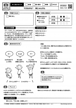 「グー、チョキ、パー」を手で出すのではなく,全身を使うじゃんけんあそびです。「グー」=ひざを曲げてしゃがむ。「チョキ」=手と足を前後に広げる。「パー」=両手、両足を横に広げる。まずは動きを覚えてからスタート。ゲーム感覚で楽しみながら思い切り体を動かしましょう。