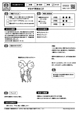 - 風船 2人に1個(割れたときの予備も用意)※ポリ袋をふくらませたものでも代用できる,ビニールテープやひも(スタートライン用),積み木やペットボトル(折り返し地点の目印)