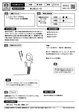 走るのではなく、足のつま先に反対の足のかかとをつけて歩くレースです。「よーい、どん!」でスタートして、早くゴールした方の勝ち。普段の歩き方とは全く違う歩き方が意外と難しい。異年齢でも一緒に楽しめます。限られたスペースで少ない人数でもでき、室内で足音を気にせずあそべます。
