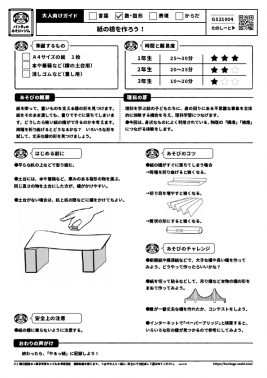 紙を使って、重いものを支える橋の形を見つけます。紙をそのまま渡しても、重りですぐに落ちてしまいます。どうしたら強い紙の橋ができるのかを考えます。両端を折り曲げるとどうなるかな? いろいろな形を試して、丈夫な橋の形を見つけましょう。