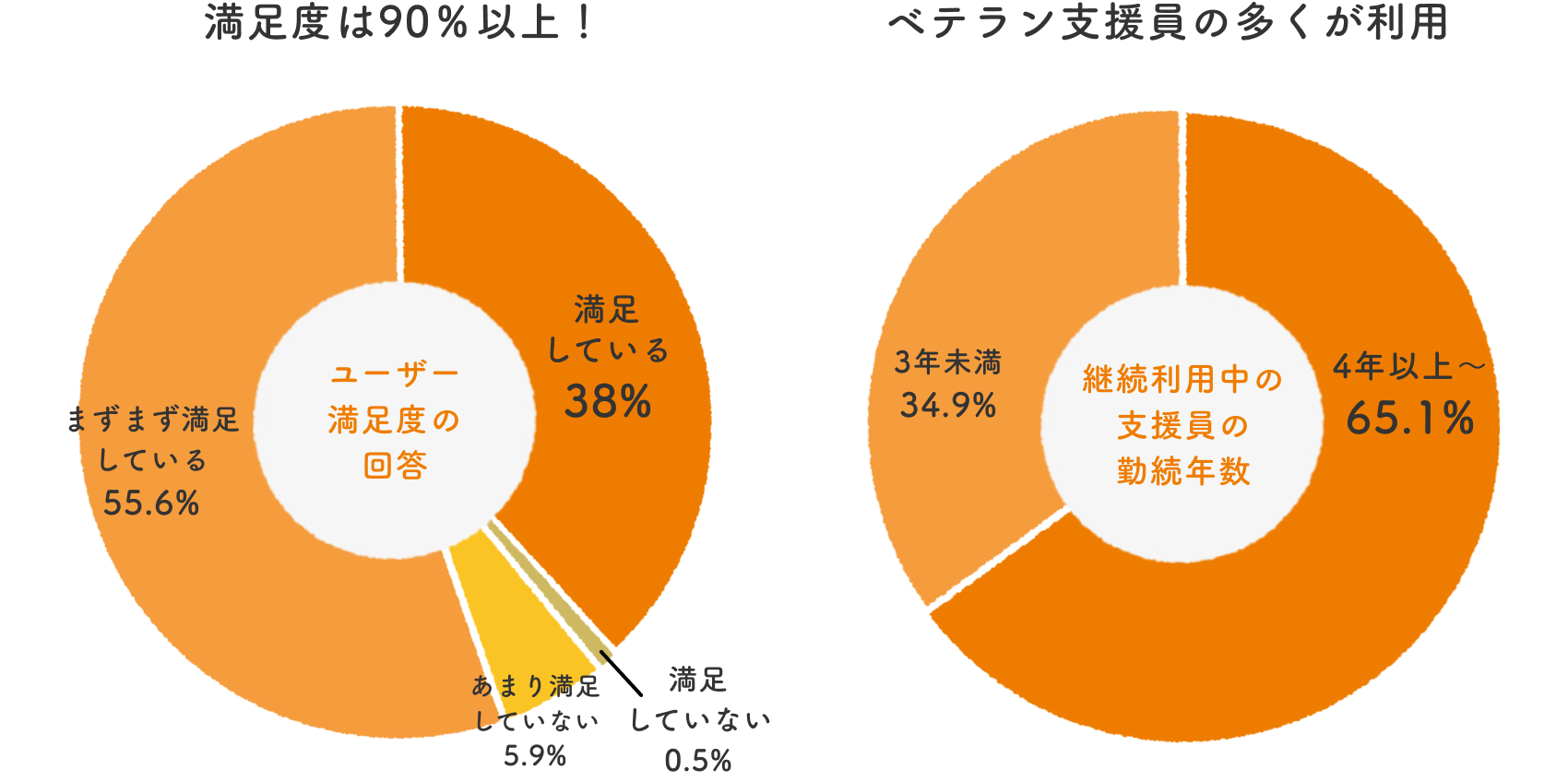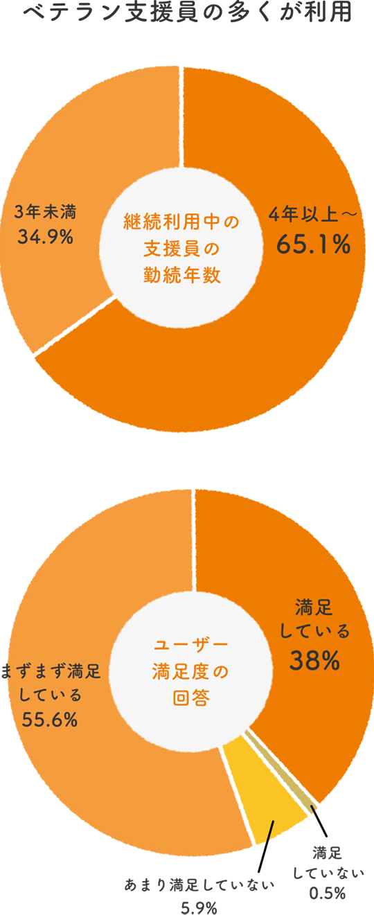 実際に「たのしーと」や企業連携プログラムを体験した多くの支援員の方から「満足度が高い」と回答いただいています。また経験豊富なベテラン支援員の方にも、継続して利用いただいています。